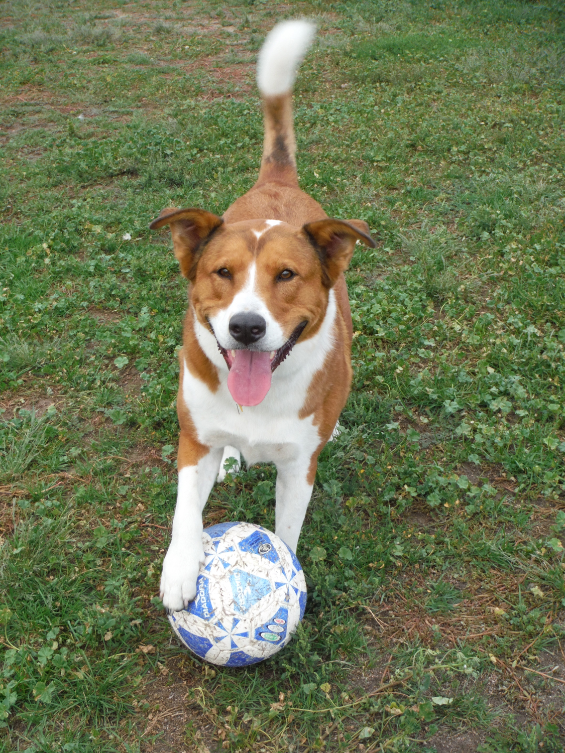 This is Flash. He is amazing with the balls and he is crazy for them. All you have to do is kick his ball once and he is happy. Flash is able to dribble the ball and knock it to the fence. He could keep up with kids on any soccer team.